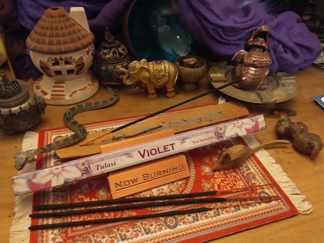 My blast-from-the-past box is the box that keeps giving. There are many incenses I've reviewed in there, but as I scrummage through I keep finding packets that haven't been touched - such as this Violet by Tulasi. I like the smell of Parma Violets - it's a synthetic scent, but a decent one. And it crops up now and again in incense, though not that often by itself. And when it does, as with