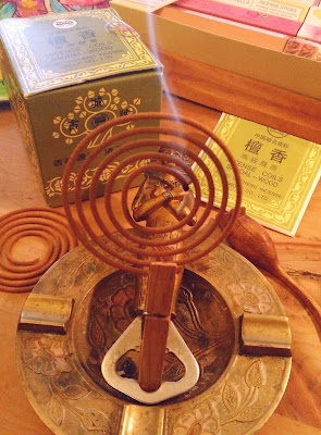 The Chinese incense I have experienced has been low, everyday quality. Packed to look pretty, and sold in volume. The sticks are very thin, and it's an individual choice to burn just the one for a light fragrance, or several sticks at the same time for a more enveloping experience. The Chinese follow the Asian tradition of using wood powder blended with joss powder and perfumed lightly with fragrance oils. Sandalwood is widely used as the wood powder, though mostly the sandalwood used doesn't contain much oil - either it is not the heartwood, or the oil has already been extracted. In addition to thin dhoops, the Chinese like to make shaped tablets - such as the small auspicious cloud. Videos of making Chinese incense: Han Fang Xiang and hand made lavender sticks.